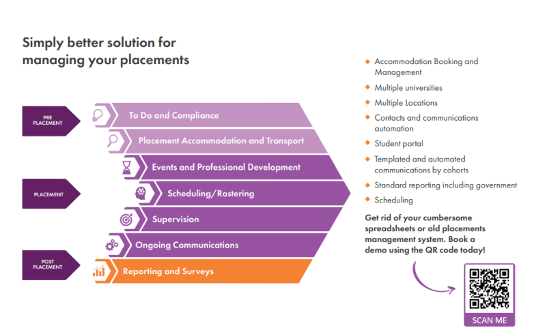 Co-designed by users from two universities over the past 15 years, P+ adds high quality value to placement management. P+ is a flexible, purpose-built solution with the user in mind, that supports placement needs across rural, remote, and urban settings. It is highly adaptable and would be well suited to Business, Law, Engineering, Social Work, Psychology, Education, Health and other disciplines.
